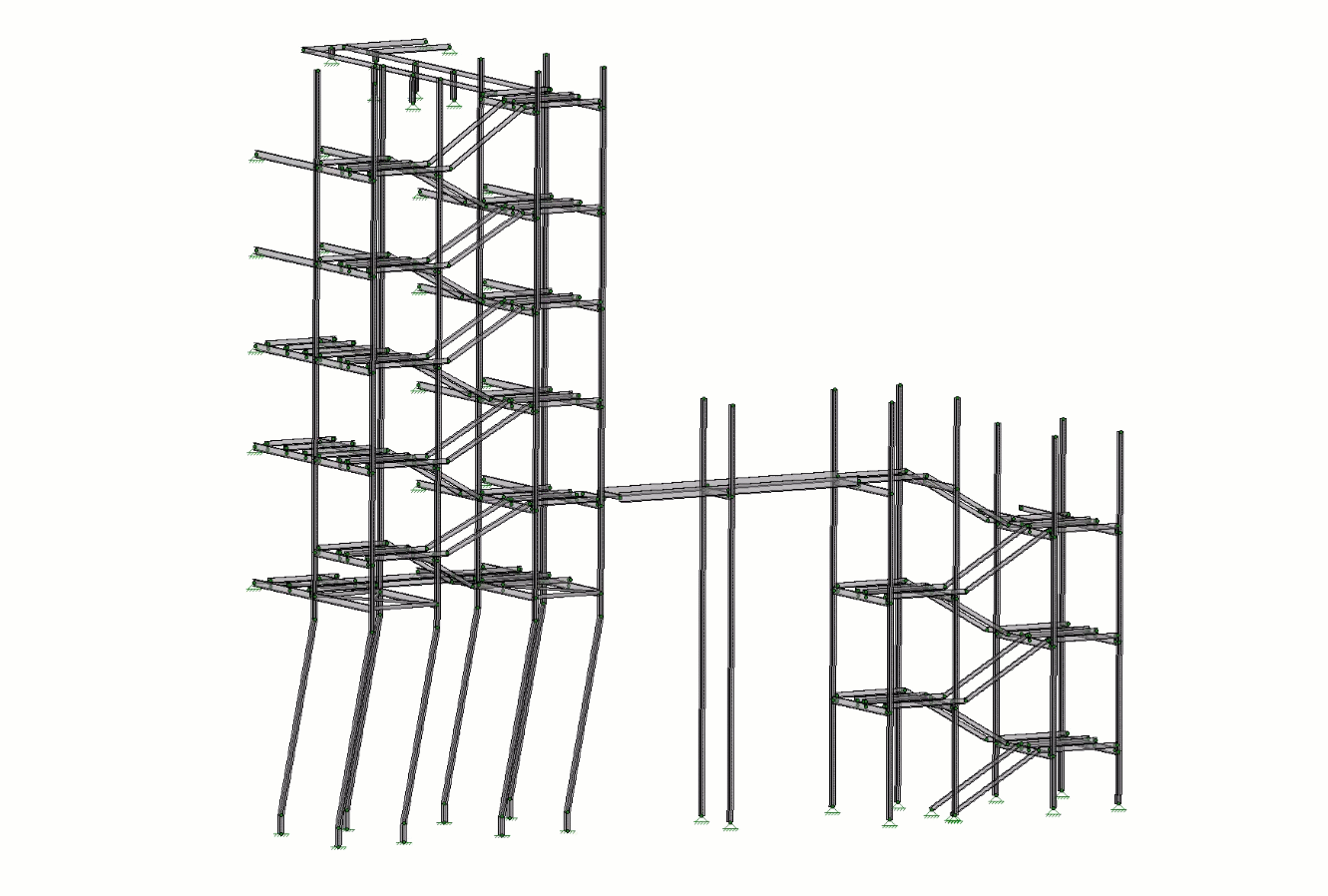 The connection between old and new was the spirit of the project but also its structural accomplishment. RISA-3D’s additional reporting and analysis output was essential to Buro Happold when designing the three pedestrian bridges connecting the two buildings. The transparency that RISA-3D offers for member analysis was paramount to Buro Happold when utilizing RISA-3D to design the custom hinge connections for the stairs as the egress stairs connect to the base-isolated Geffen Theater but also to the fixed ground. The base isolation of the structure allowed for 30 inches of movement and required the stair elements to have hinges in order to account for this movement. This scenario created large P-delta effects which were included in the RISA-3D finite-element analysis. RISA-3D’s flexibility in reporting results as well as member end releases and options to include p-delta effects created an accurate yet quick representation of the project’s unique structural requirements.