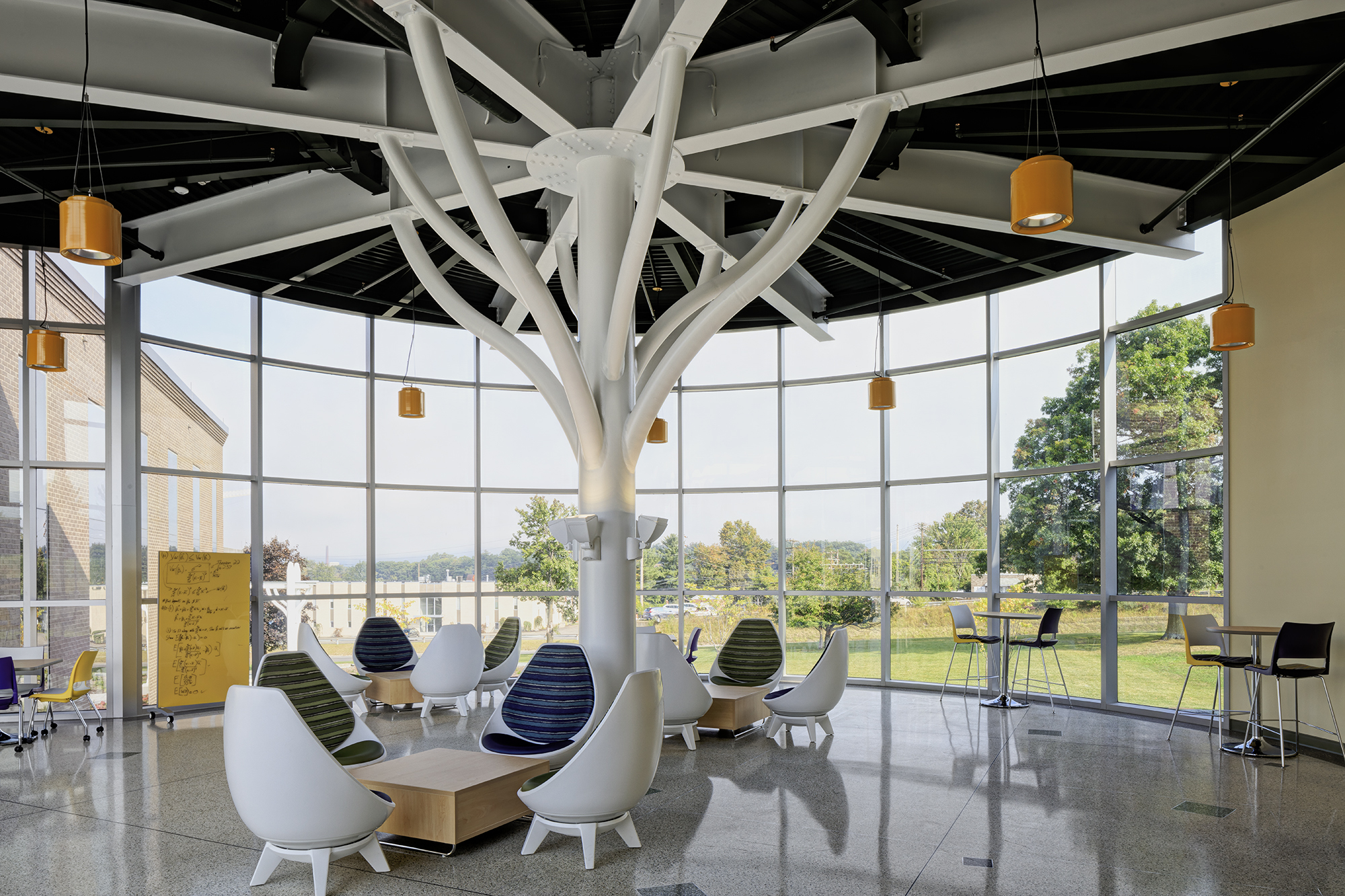 The new 105,000 sq-ft Smart Energy Building at Binghamton University is part of a series of laboratory research facilities being built on campus. The $45 million building consists of several separate programmatic spaces including two laboratory “pods”, the atrium that connects them and a rotunda structure that links the building with the Center for Excellence (COE). Overall, the main function includes physics and chemistry research lab spaces with a focus on the development of future energy technologies.