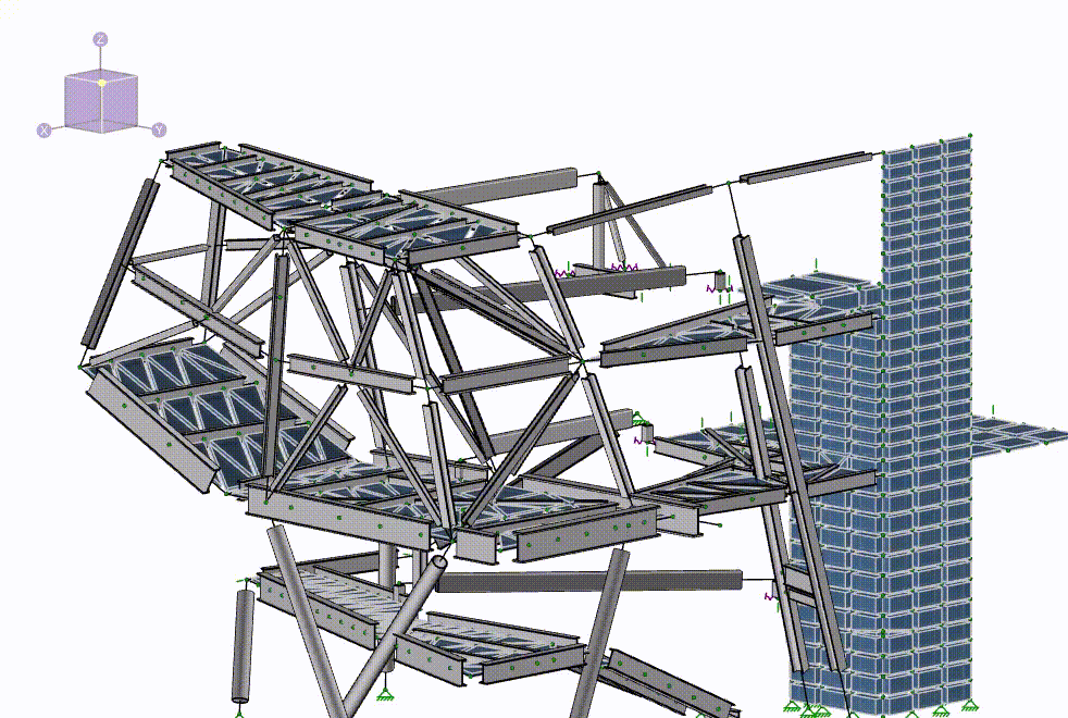 The new Orange County Museum of Art’s sculptural and complex shape was an exciting engineering challenge. The structural engineer, JAMA, and the architect, Morphosis, had to work closely and collaboratively in order to model and place the steel framing for the distinctive angles of the building’s shape. This required several iterations of the design therefore JAMA had to remain flexible to make quick structural design changes. Each of the design iterations required JAMA to re-scrutinize the structure to ensure redundancy and stability because the geometry made for not easily discernible load paths. Structurally, the building is three connected pieces. One, the classroom space which is a flexible steel framed structure. Two, the main gallery space which is the more rigid concrete structure. Finally, the glass atrium space with three bridges spanning across. The two dissimilar lateral systems meant that the two areas’ lateral movement behaved distinctly from each other while still needing the connectivity across the glass atrium. Because the atrium’s transparency was so architecturally significant, JAMA also couldn’t place any seismic joints through the atrium. One of the solutions was to design steel beams that were part of the glass bridges spanning across the atrium, and beams supporting the glass atrium acting as seismic struts.