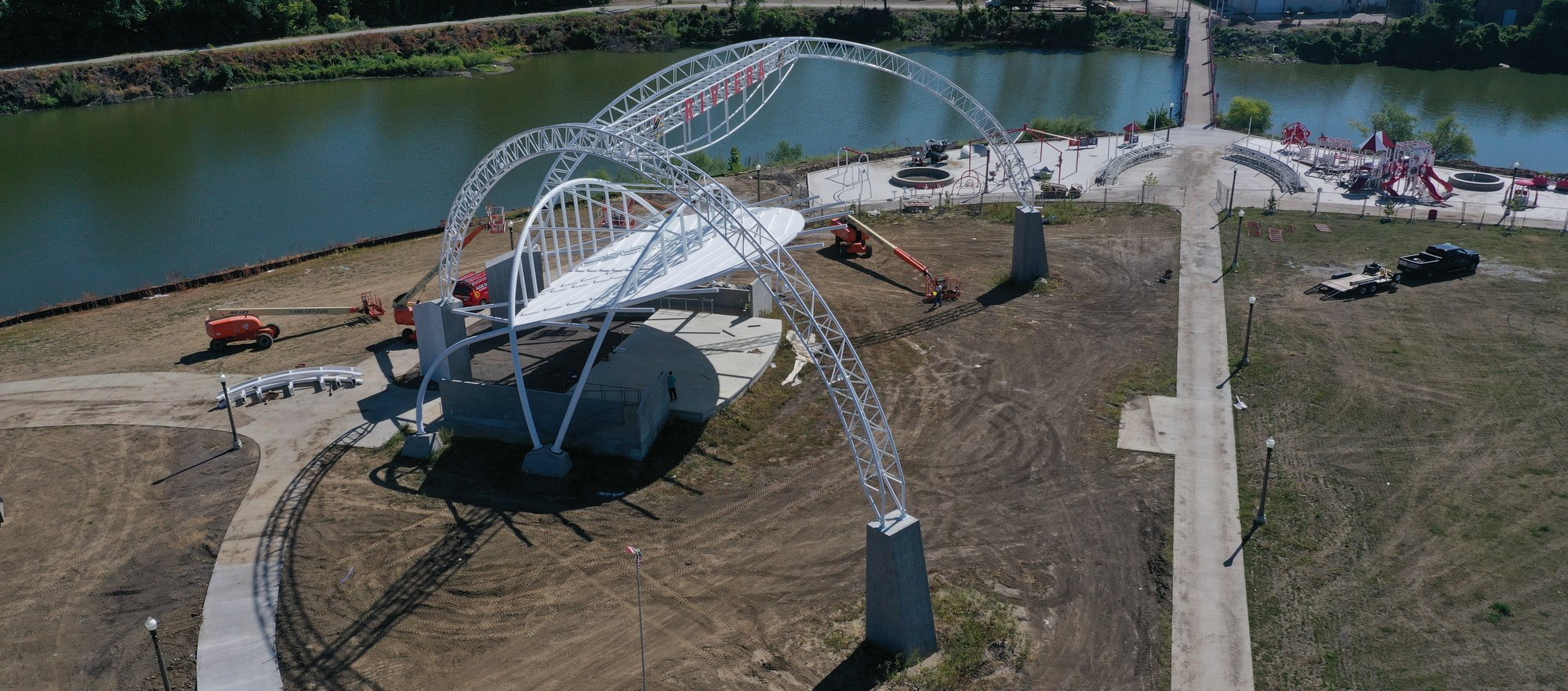 During most of the 20th century, Riverview Park in Des Moines, Iowa was home to Riverview Amusement Park, a popular family entertainment oasis that included the nationally-known Riviera Ballroom. After its closure in 1978, the site sat empty for decades until it was recently redeveloped to include the new Riviera Stage. The stage is a celebration of the city’s history and aims to bring performance back to the island that lies between the Des Moines River.