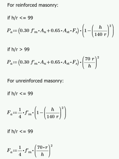 The calculation of Pa for reinforced masonry is Equation 8-16 or 8-17 and Fa for unreinforced masonry is per either Equation 8-11 or 8-12, depending on the h/r ratio. The equations are as follows: